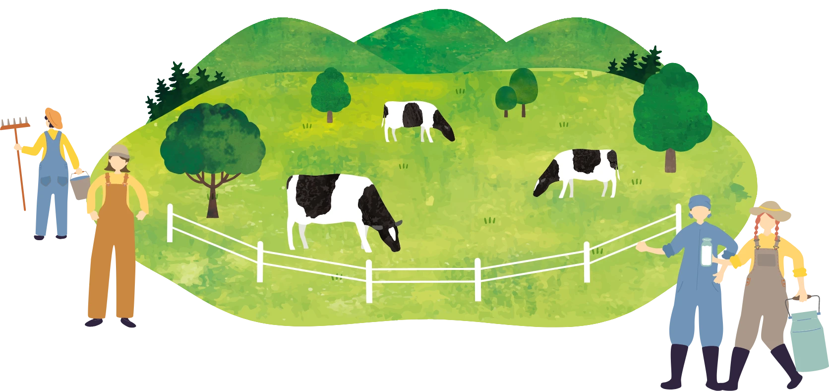 生乳生産を守り、酪農家の暮らしを支えながら、消費者のみなさんに牛乳の恵みを届ける橋渡しをしています。牛・人・自然の共生をめざし、次世代へつながる酪農の未来を育んでいきます。